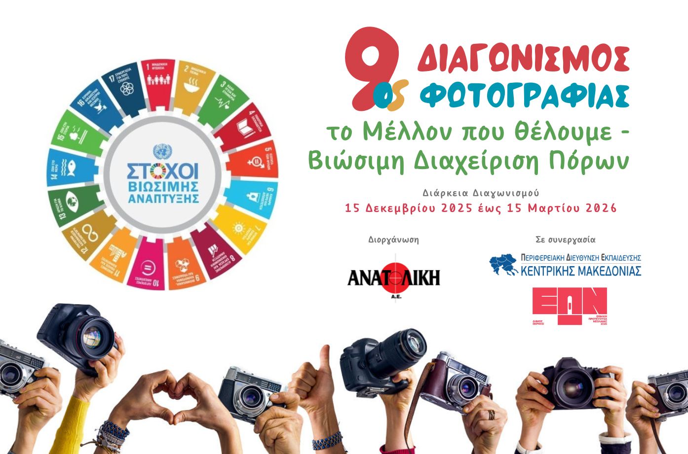 Ο Αναπτυξιακός Οργανισμός Τοπικής Αυτοδιοίκησης, ΑΝΑΤΟΛΙΚΗ Α.Ε., σε συνεργασία με την Περιφερειακή Διεύθυνση Εκπαίδευσης Κεντρικής Μακεδονίας, διοργανώνει τον 9o Διαγωνισμό Φωτογραφίας με θέμα «ΤΟ ΜΕΛΛΟΝ ΠΟΥ ΘΕΛΟΥΜΕ – ΒΙΩΣΙΜΗ ΔΙΑΧΕΙΡΙΣΗ ΠΟΡΩΝ», στον οποίο προσκαλούνται να συμμετέχουν μαθητές και μαθήτριες Γυμνασίων και Λυκείων (έως 18 χρονών) της Περιφέρειας Κεντρικής Μακεδονίας.