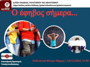 Την Τετάρτη 23 Νοεμβρίου 2022 στο Πολιτιστικό Κέντρο Θέρμης θα διεξαχθεί θεματική ημερίδα με θέμα: «Ο έφηβος σήμερα…»… Read More