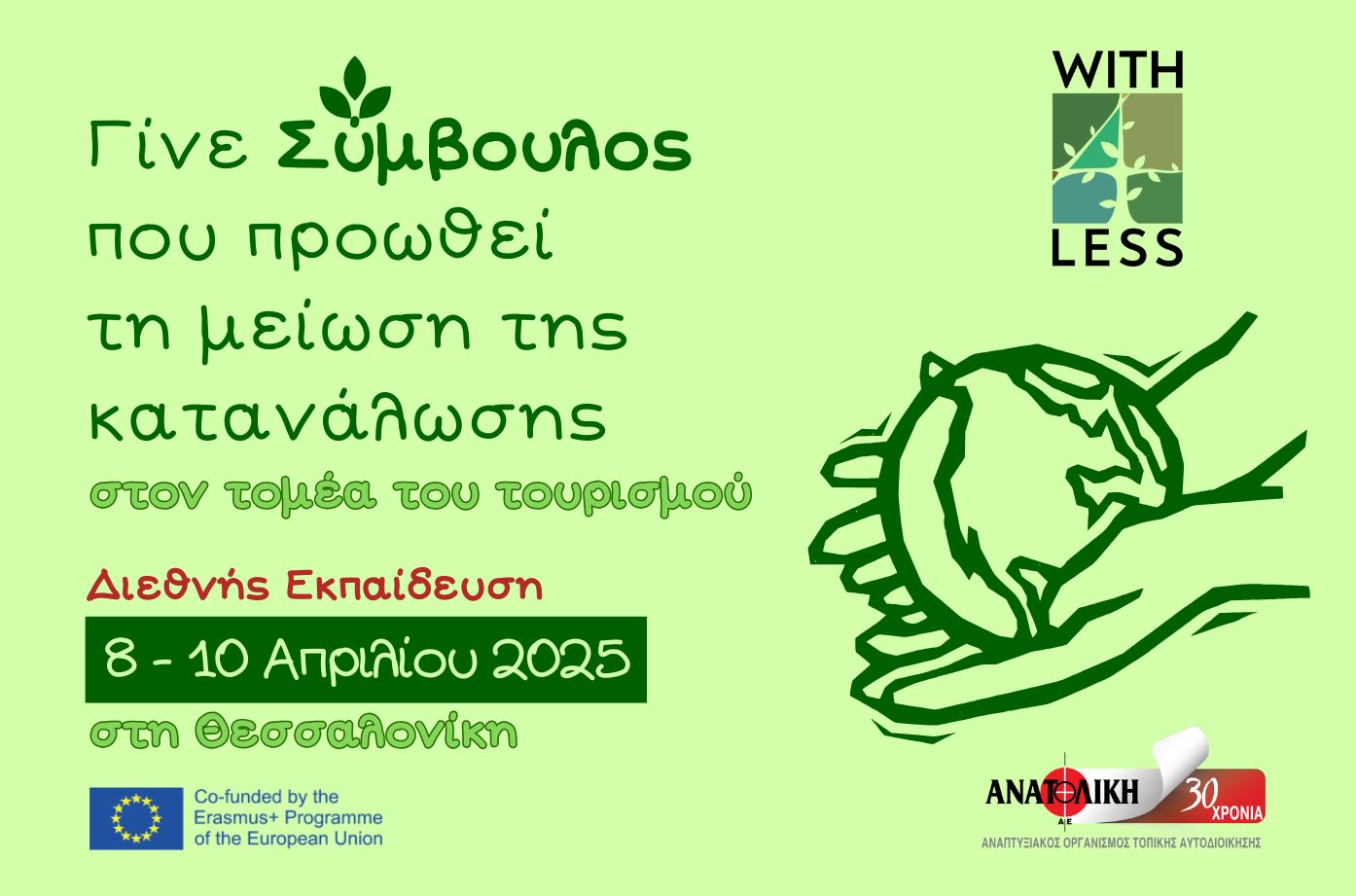 Η ΑΝΑΤΟΛΙΚΗ Α.Ε. συμμετέχει ως εταίρος στο έργο WITH4LESS (Erasmus+) το οποίο επιδιώκει να δημιουργήσει μία νέα κατηγορία παροχής υπηρεσιών στον κλάδο του τουρισμού που θα συνεισφέρει στην πράσινη μετάβαση με απλές και αποτελεσματικές ενέργειες. Το έργο προβλέπει την εκπαίδευση μίας ομάδας νέων σε ζητήματα βιώσιμου τουρισμού και την παροχή πρακτικών λύσεων και εργαλείων ώστε αυτοί/ες να είναι σε θέση να υποστηρίξουν επιχειρήσεις και παρόχους υπηρεσιών (δημοσίων και ιδιωτικών) στον τομέα του πράσινου και υπεύθυνου τουρισμού. Τα πεδία ενδιαφέροντος της προσέγγισης του WITH4LESS αφορούν: τη βέλτιστη διαχείριση των βασικών πόρων (νερό και ενέργεια), τη μείωση των αποβλήτων και τη βελτίωση της βιώσιμης συμπεριφοράς στον τομέα του τουρισμού από παρόχους υπηρεσιών και επισκέπτες. Οι Σύμβουλοι Βιώσιμου Τουρισμού που θα δημιουργηθούν θα είναι σε θέση να προσφέρουν συμβουλευτική για πιο υπεύθυνες και βιώσιμες υπηρεσίες στον τομέα του τουρισμού, συμβάλλοντας μ’ αυτόν τον τρόπο στην προώθηση της κυκλικής και πράσινης οικονομίας και κατά συνέπεια στην καταπολέμηση της κλιματικής αλλαγής.