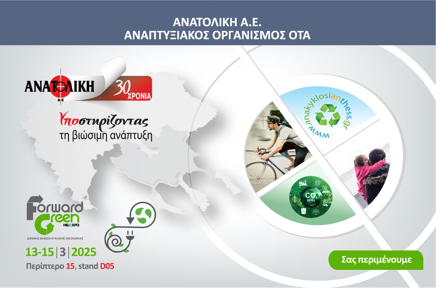 Η Ανατολική A.E., Αναπτυξιακός Οργανισμός Τοπικής Αυτοδιοίκησης, συμμετέχει στη 3η Διεθνή Έκθεση Κυκλικής Οικονομίας, Forward Green, που διοργανώνεται στο Διεθνές Εκθεσιακό και Συνεδριακό Κέντρο Θεσσαλονίκης από την HELEXPO, από τις 13 έως τις 15 Μαρτίου 2025 (Περίπτερο 15, ισόγειο, stand D05).
