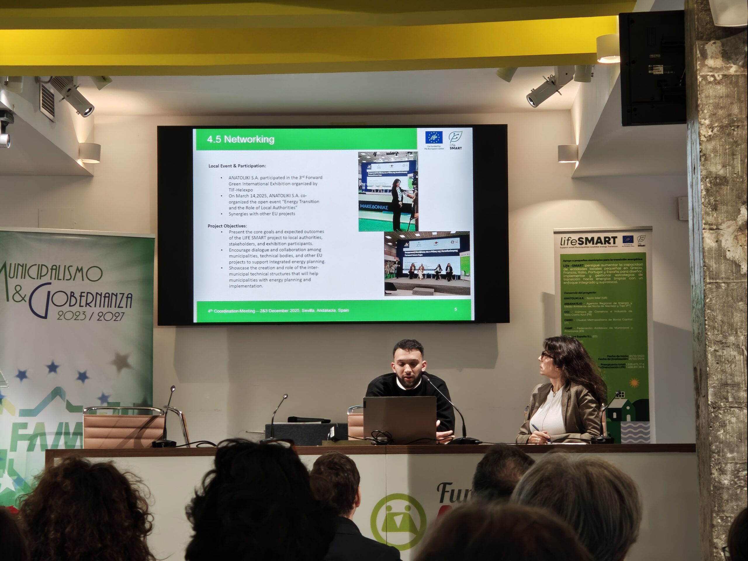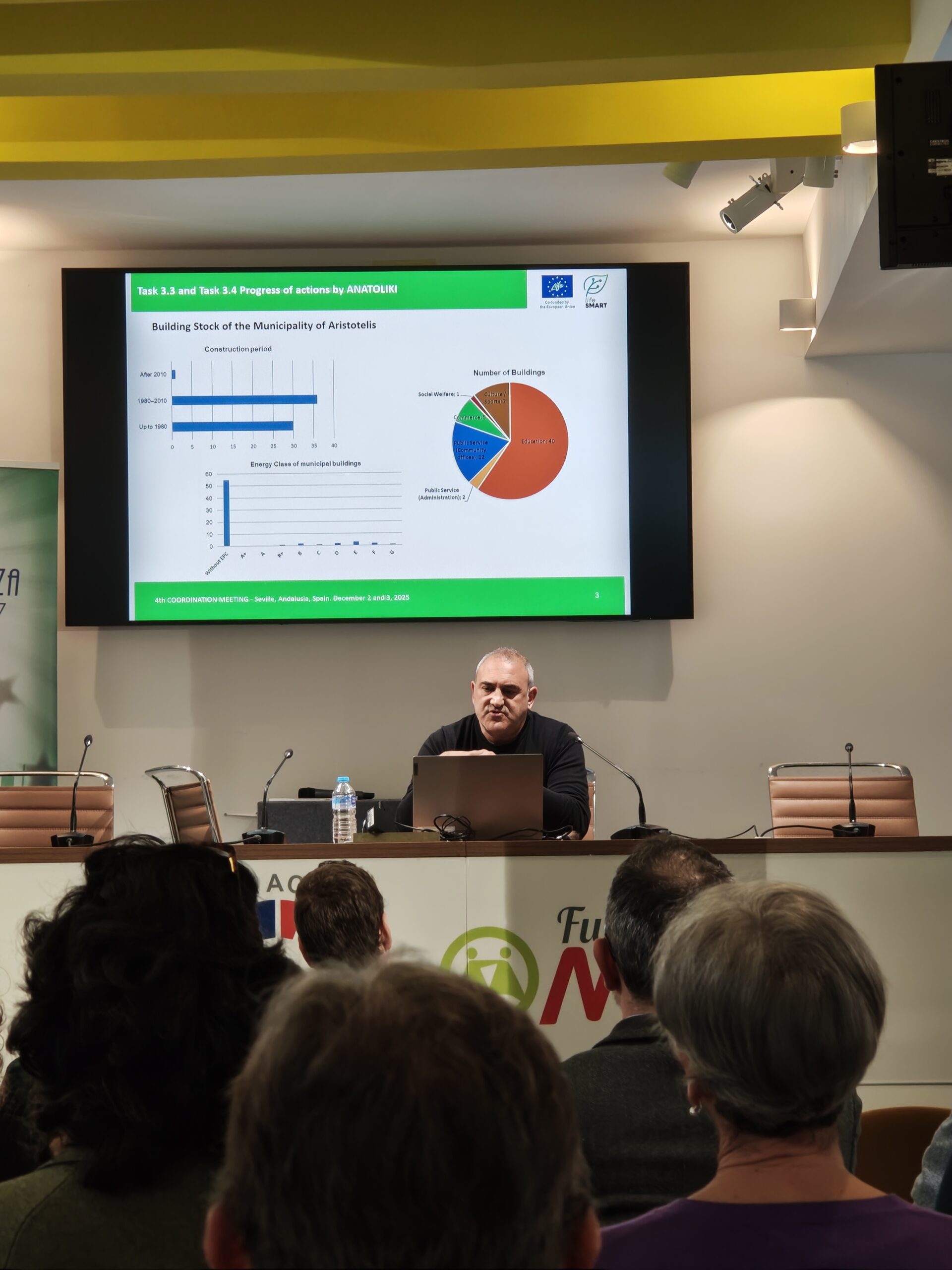 Η ΑΝΑΤΟΛΙΚΗ A.E., Αναπτυξιακός Οργανισμός Τοπικής Αυτοδιοίκησης, συμμετείχε ενεργά στην 4η Συντονιστική Συνάντηση του ευρωπαϊκού έργου LIFE SMART, που πραγματοποιήθηκε στις 2 και 3 Δεκεμβρίου 2025 στη Σεβίλλη της Ανδαλουσίας, με τη φιλοξενία της Federación Andaluza de Municipios y Provincias (FAMP) – εταίρος του έργου. Εκπρόσωποι όλων των εταίρων από Ελλάδα, Πορτογαλία, Ιταλία και Ισπανία είχαν την ευκαιρία να συζητήσουν αναλυτικά την πορεία των δράσεων, να παρουσιάσουν την πρόοδο των εργασιών και να συντονίσουν τα επόμενα βήματα έως τη λήξη του έργου.