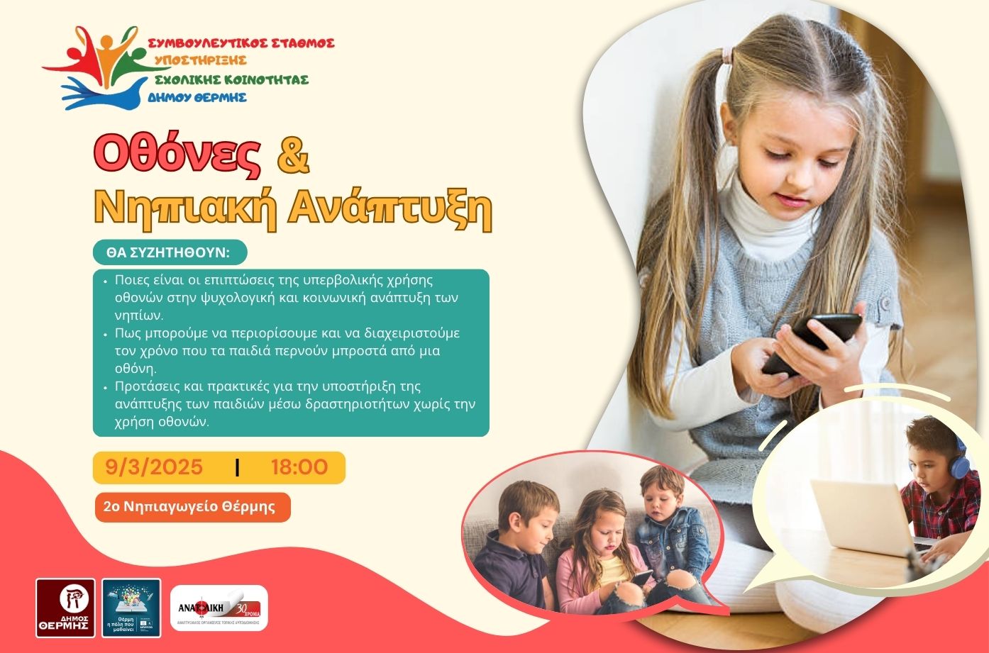 Ο Συμβουλευτικός Σταθμός Υποστήριξης Μαθητών και Γονέων του Δήμου Θέρμης σε συνεργασία με το 2ο Νηπιαγωγείο Θέρμης σας προσκαλούν στην ομιλία με θέμα «Οθόνες και Νηπιακή Ανάπτυξη: κίνδυνοι και συμβουλές χρήσης», η οποία θα πραγματοποιηθεί την Τετάρτη, 9 Απριλίου, στις 18:00 στο χώρο του Νηπιαγωγείου.