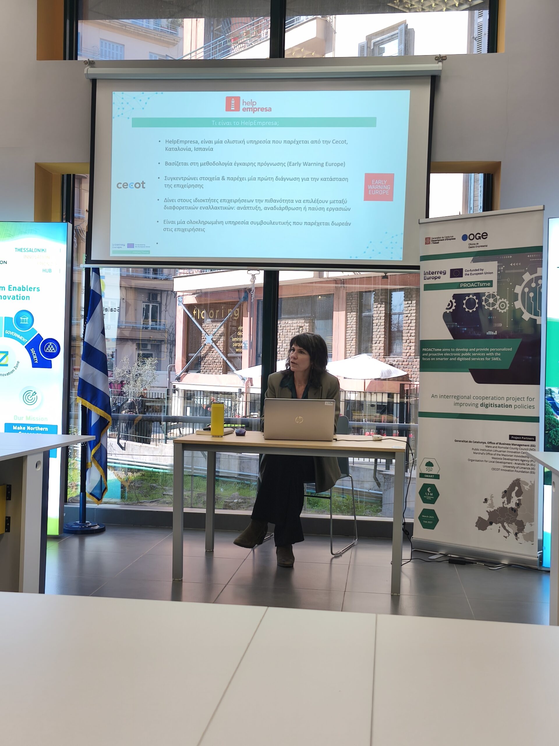 The second part of the event started with an introduction from PALMOS Analysis’ research on SMEs in the region and continued with a presentation of the Catalan SME support model ‘HelpEmpresa’, a good practice of the project, by Ms. Naya Tselepi, Dr. Human Geography and Project Manager from ANATOLIKI S.A.. This was followed by Ms. Maria Goulaptsi, Head of the Department of Innovation and Entrepreneurship Support, who developed the possibilities of integrating the previous model by the Region of Central Macedonia.