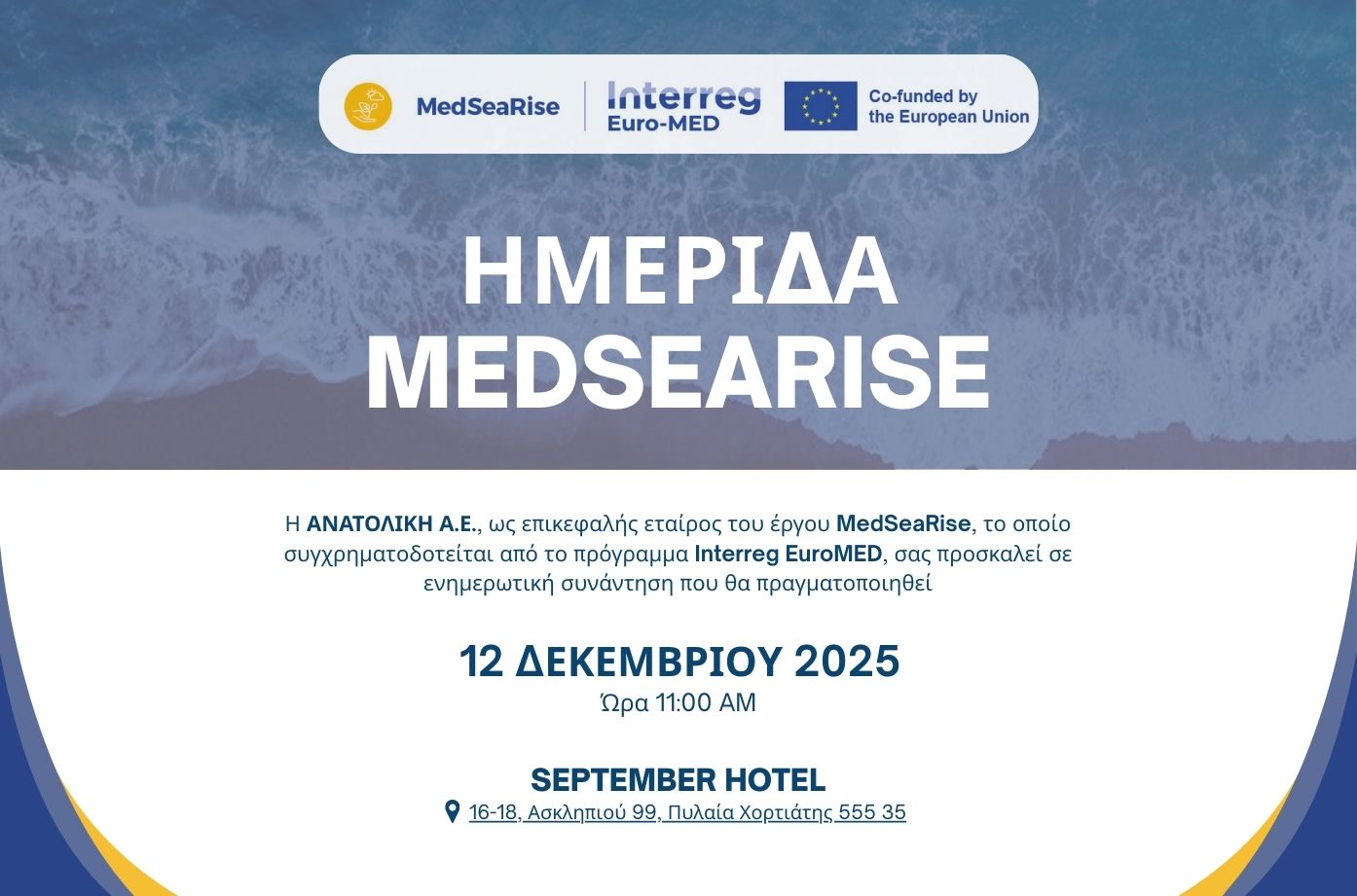 Η ΑΝΑΤΟΛΙΚΗ Α.Ε., ως επικεφαλής εταίρος του έργου MedSeaRise, το οποίο συγχρηματοδοτείται από το πρόγραμμα Interreg EuroMED, σας προσκαλεί σε ενημερωτική συνάντηση που θα πραγματοποιηθεί την Παρασκευή 12 Δεκεμβρίου 2025, και ώρα 11:00 – 13:00, στο September Hotel, Ασκληπιού 16-18, Θεσσαλονίκη (περιοχή ΙΚΕΑ).